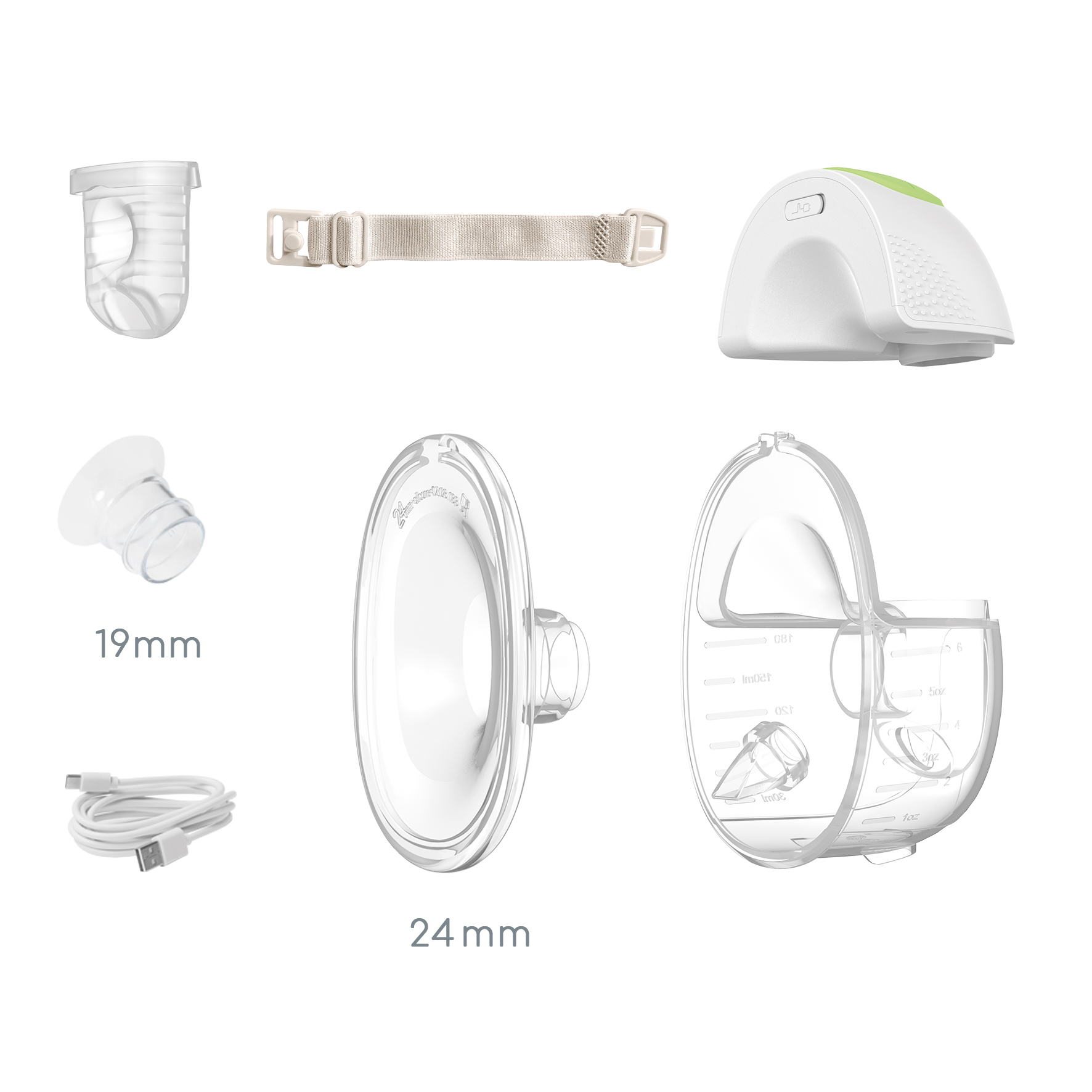 Ultradiscreet en draagbaar: draagbaar, geen slangen of snoeren, eenvoudig schoon te maken ontwerp dat vaatwasmachinebestendig (excl. de kolf motor) is, met een lekvrije cup van 180 ml. en 1 meegeleverde siliconen inzetstuk van 19 mm en 1 beha verleningsbandje voor gemak onderweg.